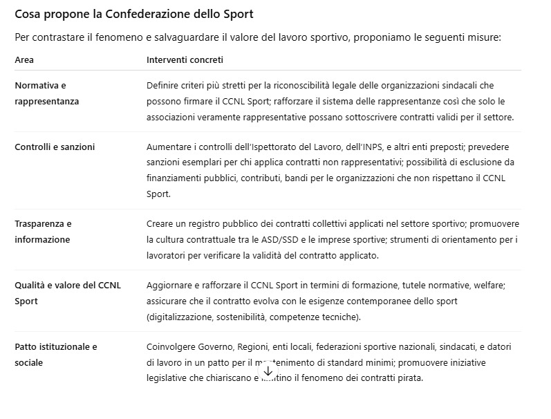 Per contrastare questa deriva, la Confederazione dello Sport propone un piano di interventi urgenti: criteri più rigorosi per individuare i soggetti legittimati a sottoscrivere contratti collettivi, maggiori controlli da parte degli enti preposti, sanzioni efficaci per le organizzazioni che non applicano contratti riconosciuti, una maggiore trasparenza attraverso la creazione di un registro pubblico dei contratti in vigore e una valorizzazione del CCNL Sport mediante aggiornamenti capaci di rispondere alle sfide dello sport contemporaneo, come la formazione, la digitalizzazione e la sostenibilità. Fondamentale, infine, è avviare un patto tra istituzioni e parti sociali che coinvolga Governo, Regioni, federazioni, sindacati e datori di lavoro, per una governance del lavoro sportivo sana e inclusiva.